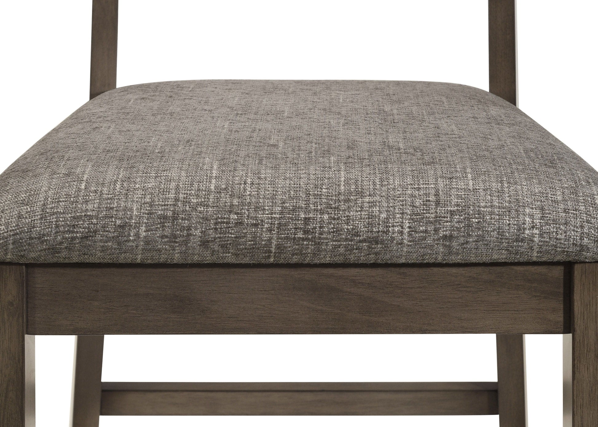 A nod to Mid Century design makes this dining group versatile for a variety of décor styles. The expandable table features sturdy angled legs and rounded corners. Upholstered chairs have a sleek squared back design.