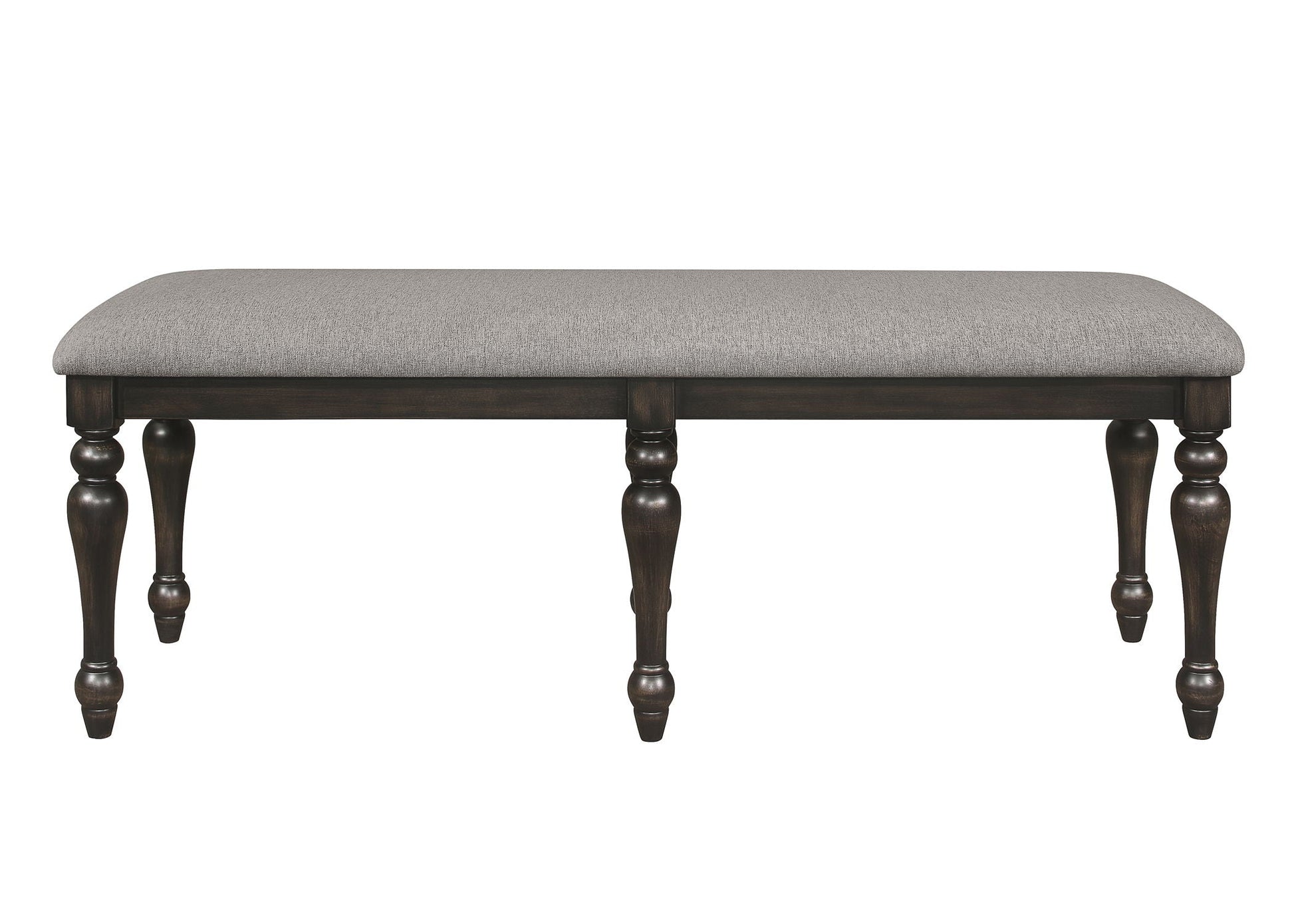 This elegant dining group brings a vintage style to your space. The sturdy 2 tone table features turned legs and a quarter matched veneer top. Seating is upholstered a decorative quatrefoil design is highlighted on the chair backs.