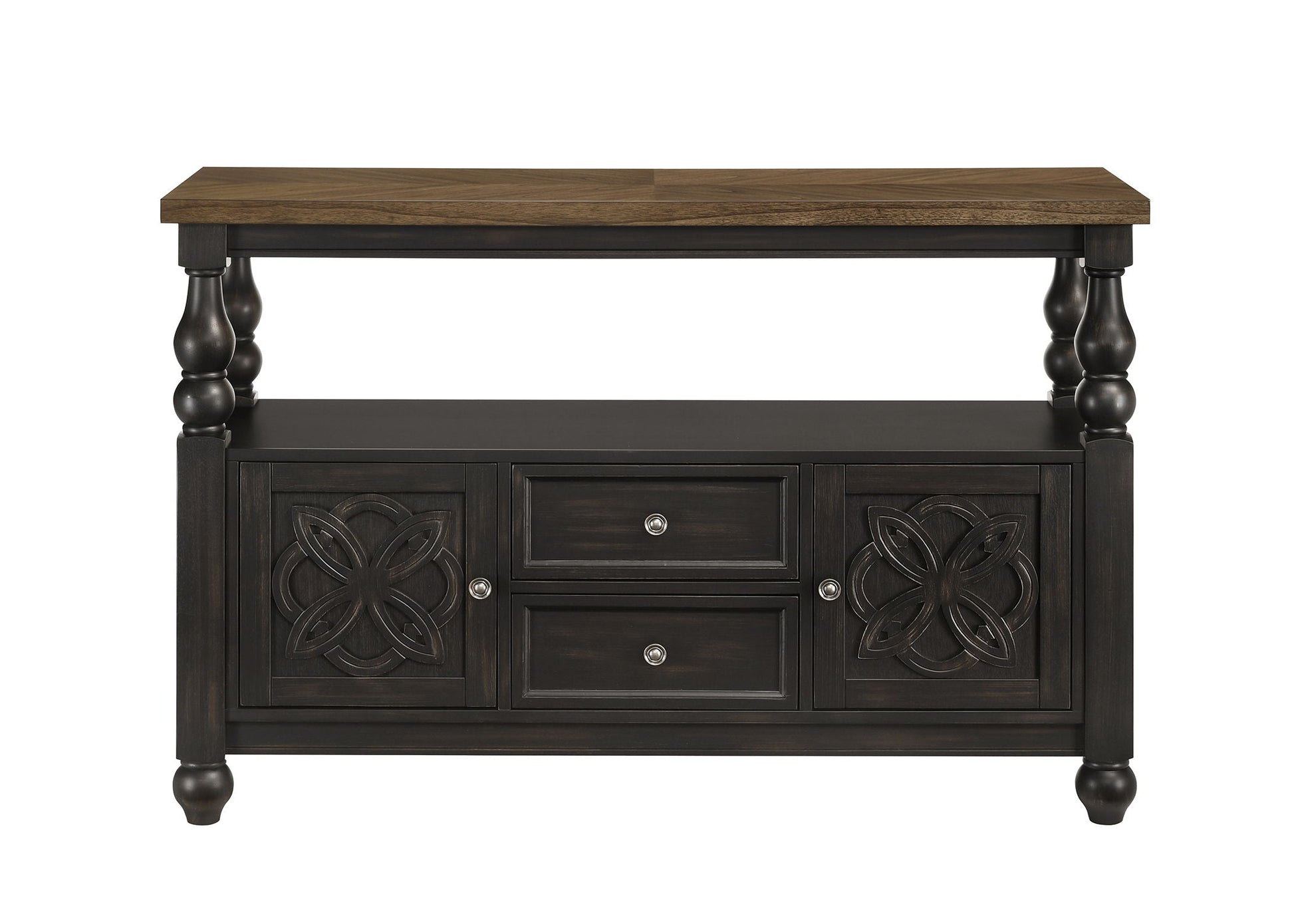 This elegant sideboard brings a vintage style to your space. The sturdy 2 tone table features turned legs and a quarter matched veneer top. A large open shelf provides space to display your items while closed cabinets and drawers keep things hidden away.