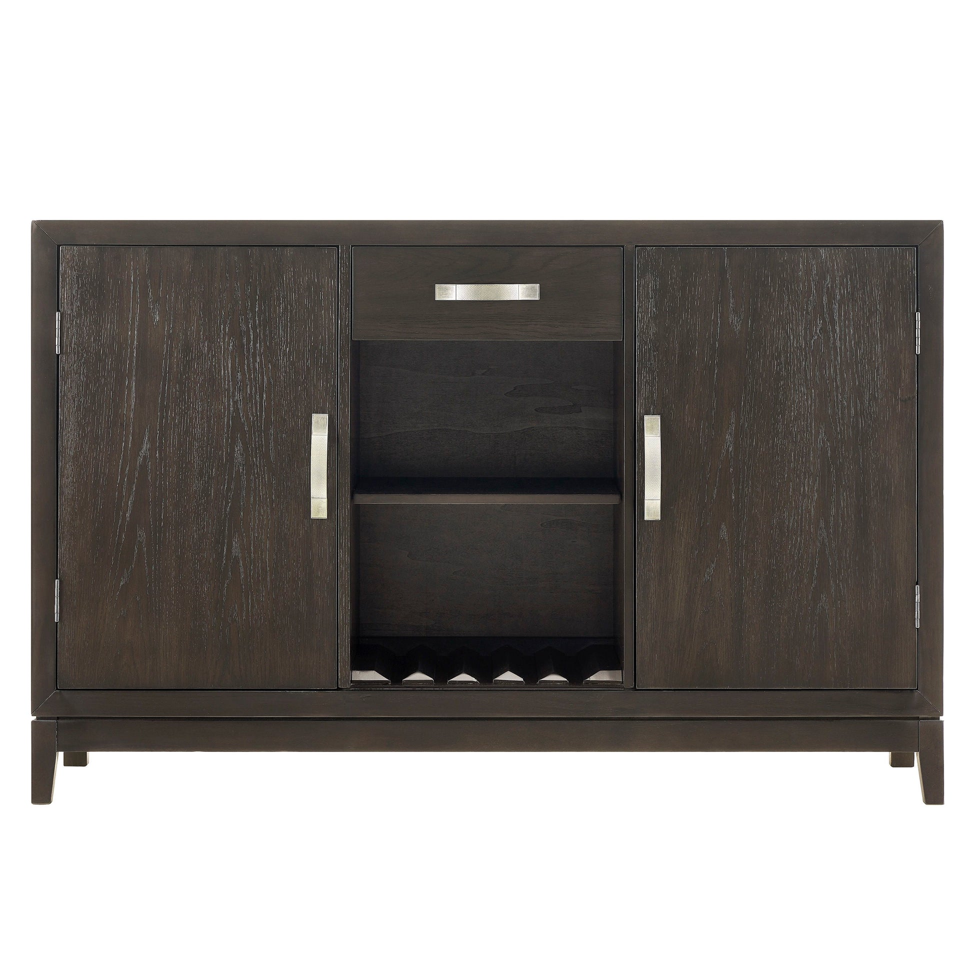 This elegant dining set exudes contemporary sophistication, featuring a robust round table at its center that anchors the space with its deep, rich finish and open pedestal base. The sleek silhouette of the high-back chairs complements the table, each one upholstered in a easy care faux leather that promises comfort and style. The accompanying sideboard, with its clean lines and ample storage, showcases visible, tasteful shelving that is perfect for displaying fine china or your favorite vintages.